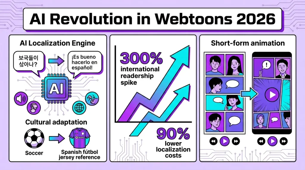 The webcomics industry is undergoing an AI-powered metamorphosis in 2026. Webtoon, the world’s largest digital comics platform, has rolled out a suite of AI localization tools, real-time translation, and automated animation features that are dismantling language barriers and democratizing content creation. These innovations arrive as 70% of Webtoon’s revenue now comes from non-English markets (Business Insider), proving that AI isn’t just a novelty—it’s a necessity for global storytelling.