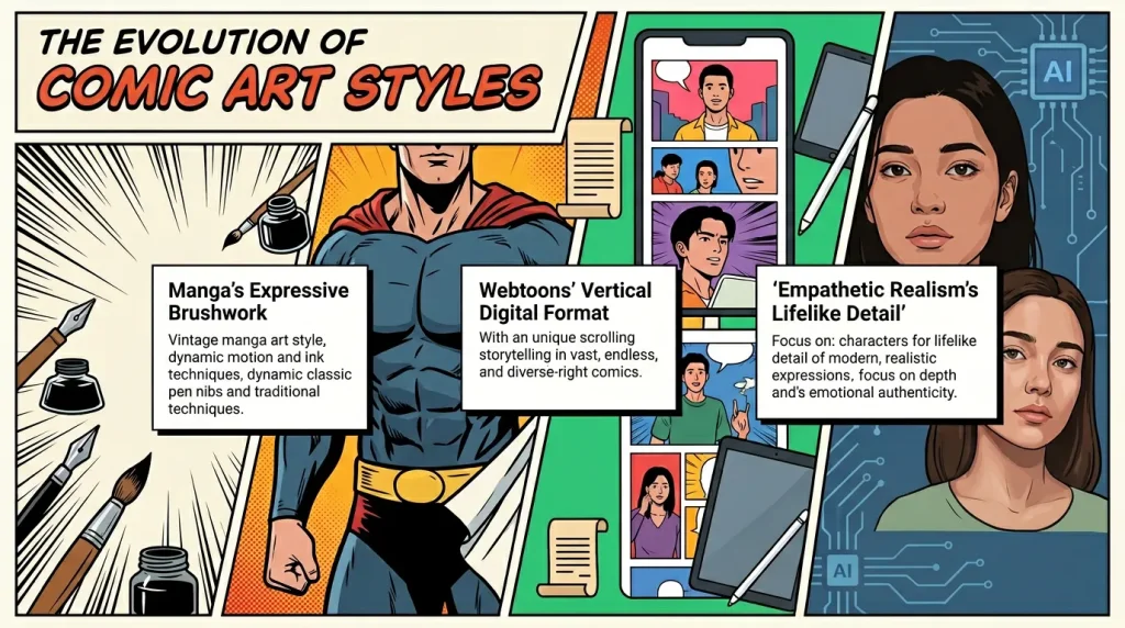Explore the history of comic art styles, from manga's unique touch to webtoons' digital rise and the growing trend of empathetic realism.