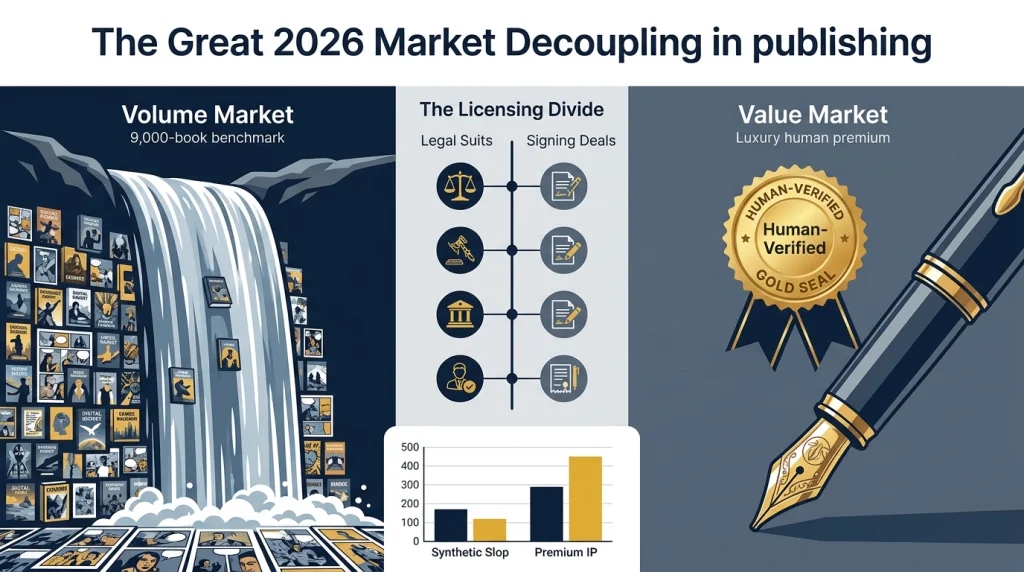 The publishing landscape of 2026 has reached a definitive tipping point. What was once a speculative "disruption" has matured into a structural decoupling of the entire industry. On one side of the rift lies a hyper-automated "Volume" market, defined by staggering output and algorithmic saturation. On the other is a "Value" market, where human scarcity and high-stakes licensing deals form a protective fortress around premium intellectual property.