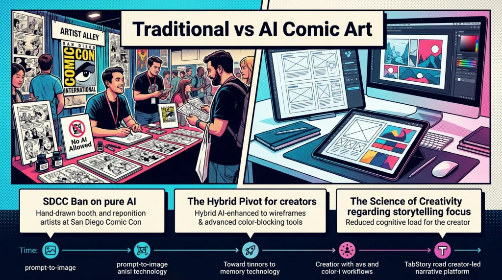 Master the balance between traditional vs AI comic art. Learn how SDCC bans impact creators and how to use AI-enhanced workflows for professional success.