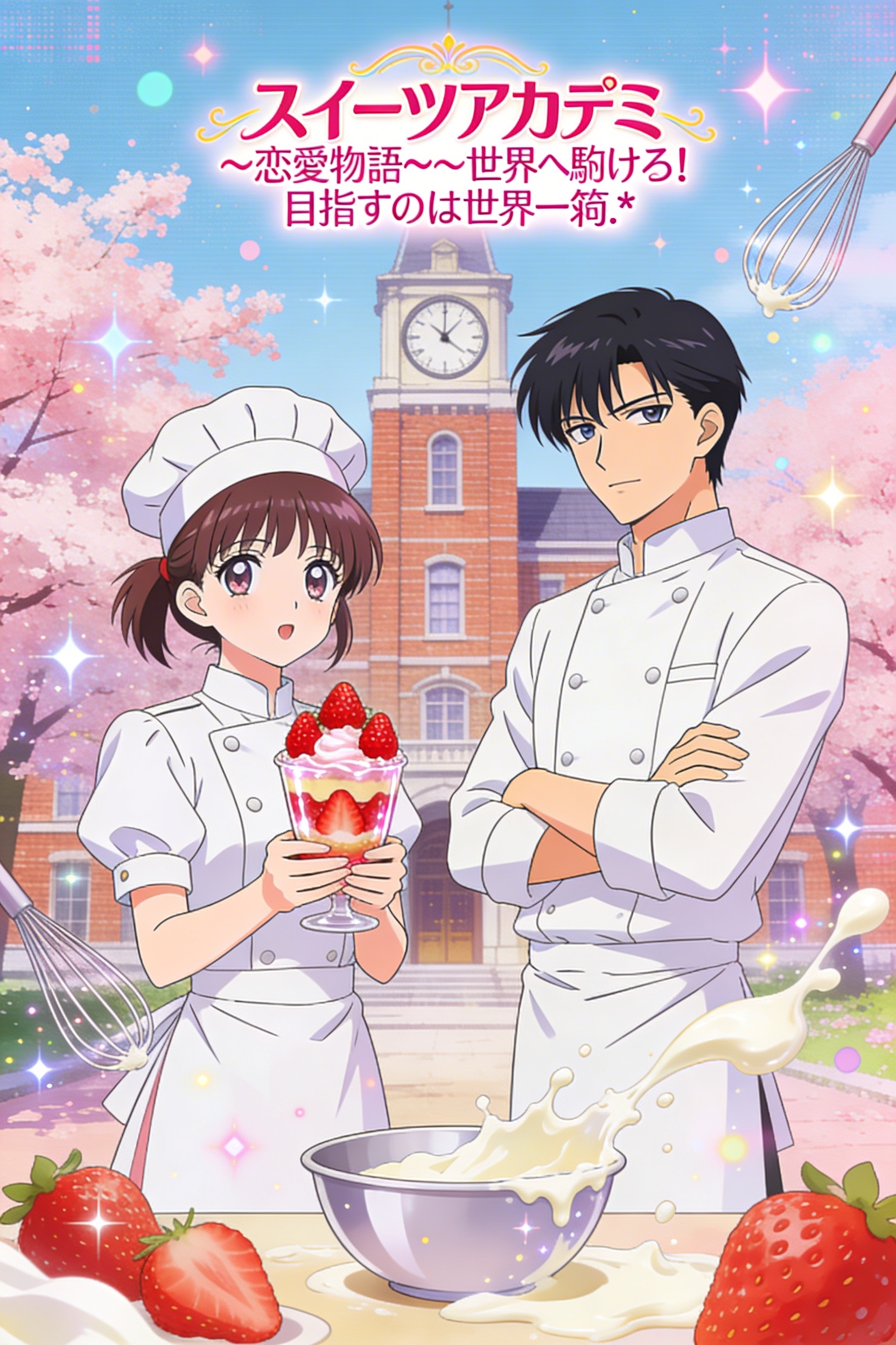 現代の日本にある名門製菓専門学校を舞台とし、桜が舞い散る春の柔らかな光が差し込む、繊細な線画とパステルカラーを基調とした透明感のある少女漫画スタイル。