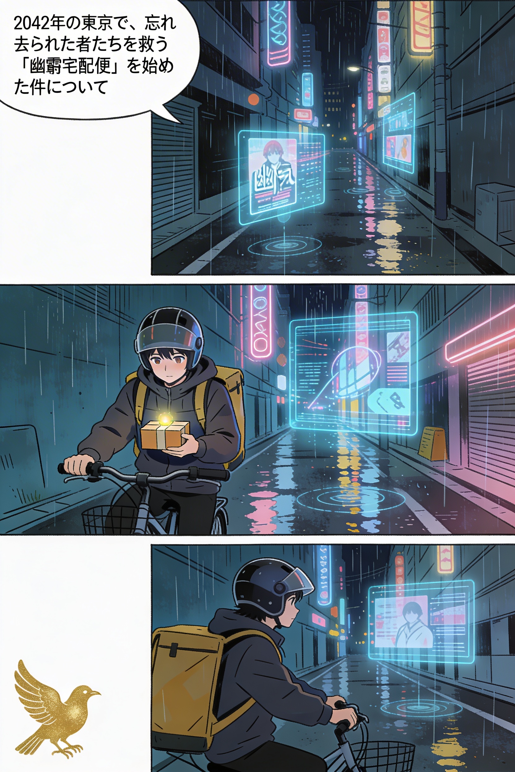 2042年の近未来の東京を舞台とし、降りしきる雨と湿った空気感、ネオンの光が反射するサイバーパンクな雰囲気漂う初秋の都市景観。