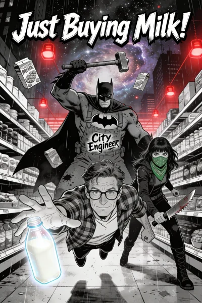 Set in a contemporary New York City during a rainy autumn night, the visual style combines gritty American street-level realism with surreal, neon-drenched multiverse elements in a high-detail modern comic book aesthetic.