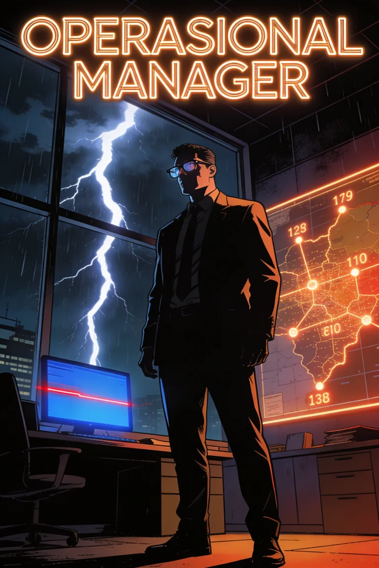 Thriller korporat bergaya noir modern yang dramatis, berlatar di kantor distributor urban Indonesia yang remang-remang selama musim badai dengan pencahayaan neon yang kontras.